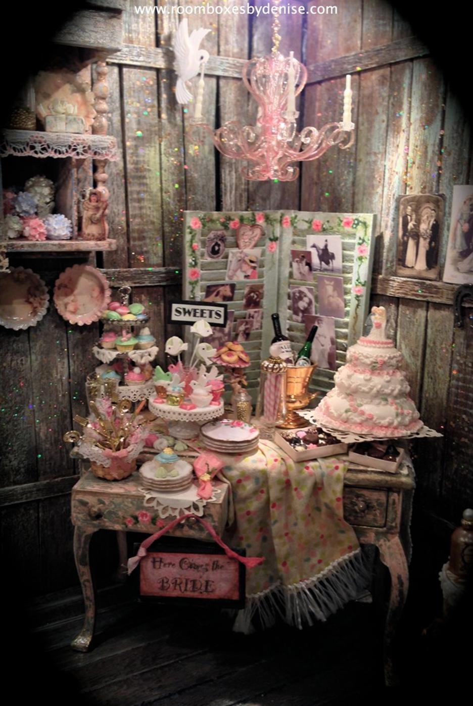 Wedding planner was a copy from a miniature magazine. I covered the candlesticks with no hole pearl beads. Candles were painted with nail polish. Cowgirl bride is a metal mini that I covered with a scrapbook product called Iced Enamels. Silver pitcher is made by Pete Acquisto. I stuffed the champagne glasses with glittered tulle.
