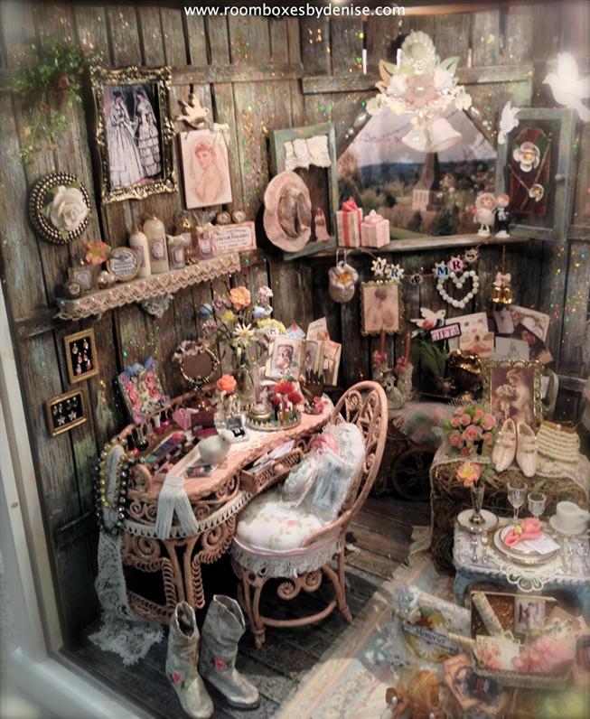 Instead of creating a traditional barn scene with the usual barnyard animals, I chose a wedding theme for this room box, in a class taught by Vikki M. Since it appears that barn weddings are trending with today's bride, I thought that the rough, dark texture of the wood would be an interesting and contrasting background against the lacy white feminine bridal trousseau. I envisioned for this room box, set designers gathering pretty bridal themed items for a photo shoot for some romantic living magazine. Completed March 2014.