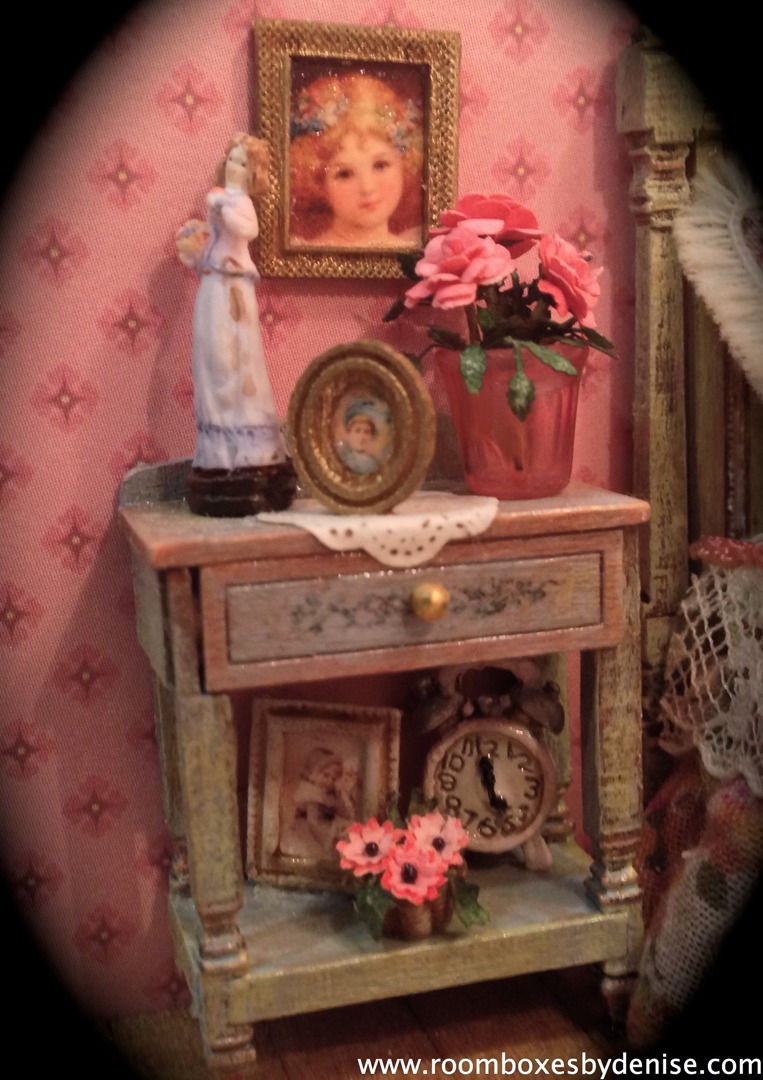 The resin blue lady figure, I believe, is manufactured by Falcon Miniatures. The frames were a laser cut kit from Shirley Blair and the roses are a Bonnie Lavish 1/2" scale kit. The clock was a metal charm that I painted. The 1/2" scale doily is made by Jeanetta Kendall.