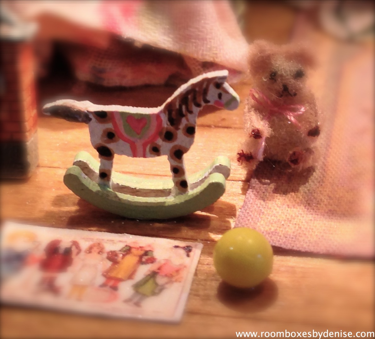 Toys include a Karen Markland rocking horse, pom pom bear purchased at a show, paper doll sheet , and ball made from a pin head.