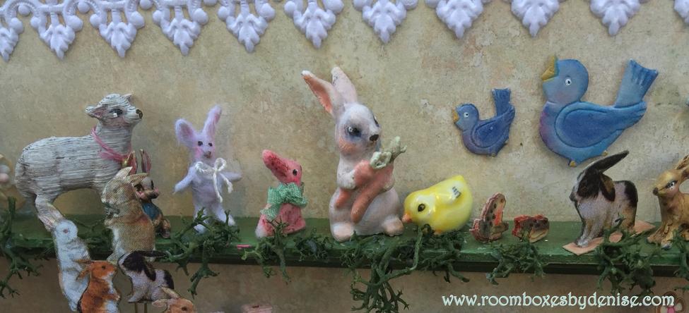 Since I had so many bunnies, chicks and other Easter critters, I decided to place them on long shelves that spanned the top of both left and right sides of the box, so that they formed a long line as if marching in an Easter Parade. I then added green moss onto the edge of the shelves because it gave the allusion of a forest setting and it looked cold and bare without the lacy moss.
