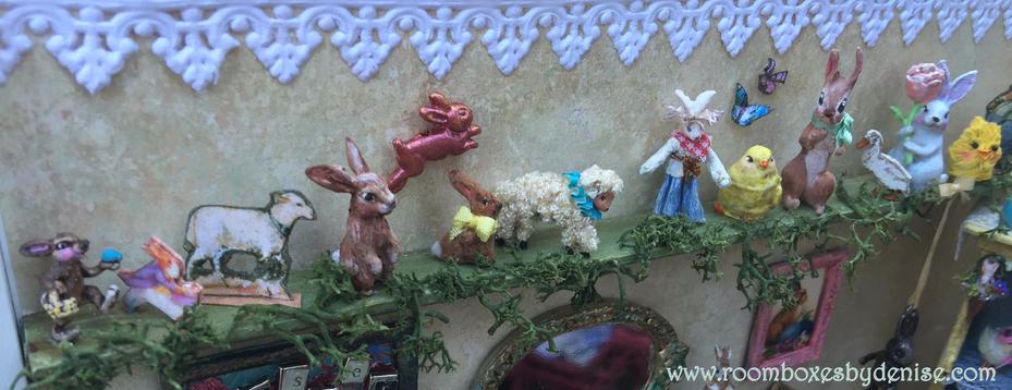 Bunny in the far back right corner of shelf was a brass charm that was painted; white Fimo bunny was purchased at a show years ago, lamb--a CH kit; white ugly bunny was made with wire and flocking.