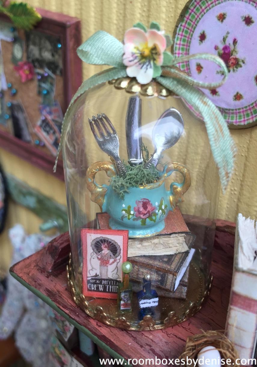I put together a kitchen-themed display and placed it under a dome purchased from Michaels. Tiny plastic bottles are a quarter scale kit that I colored with alcohol inks found in at the scrapbooking section of the crafts store.