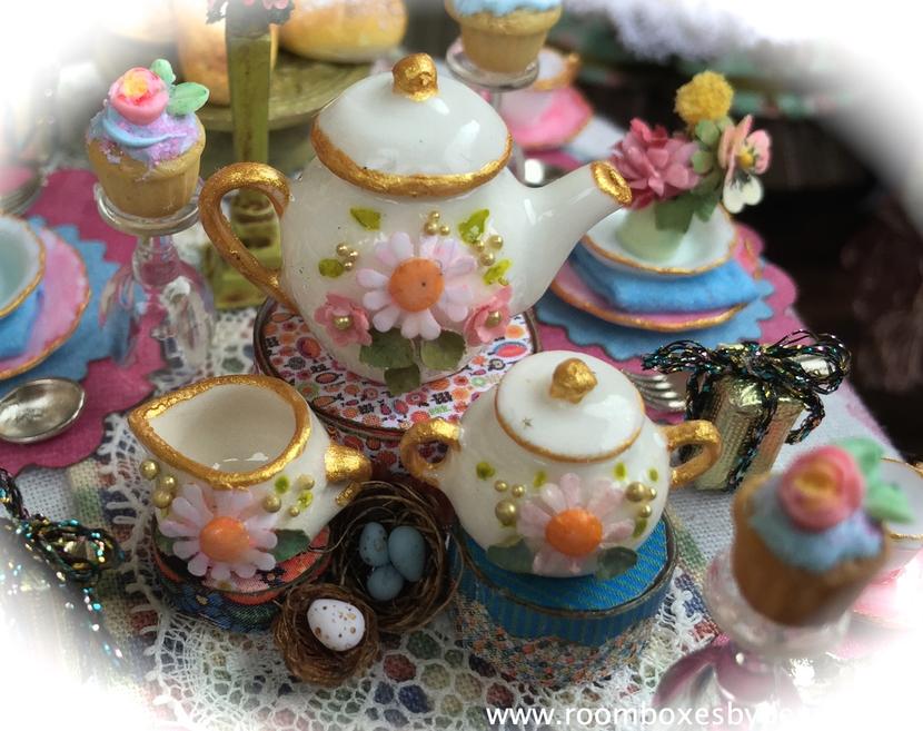 I used a Betsy Niederer cake tutorial to help me craft the yellow cake. Oops, I forgot to texturize the bottom of the cake slice. No problem.... I just added a big chocolate rose to cover my mistake. (Such is the manner that I constantly do with my miniatures, always finding ways to cover my mistakes!!) I made the crust on the cherry cobbler with clay and railroad gravel to give it a crumbly look. I covered the 2 large plates in the background with patterned decal paper and the stack of plastic bowls were a China Ebay purchase. I made the white bunny with a bunny metal bead, mold maker and air dry clay. Stack of Chrysnbon plates were painted with nail polish.