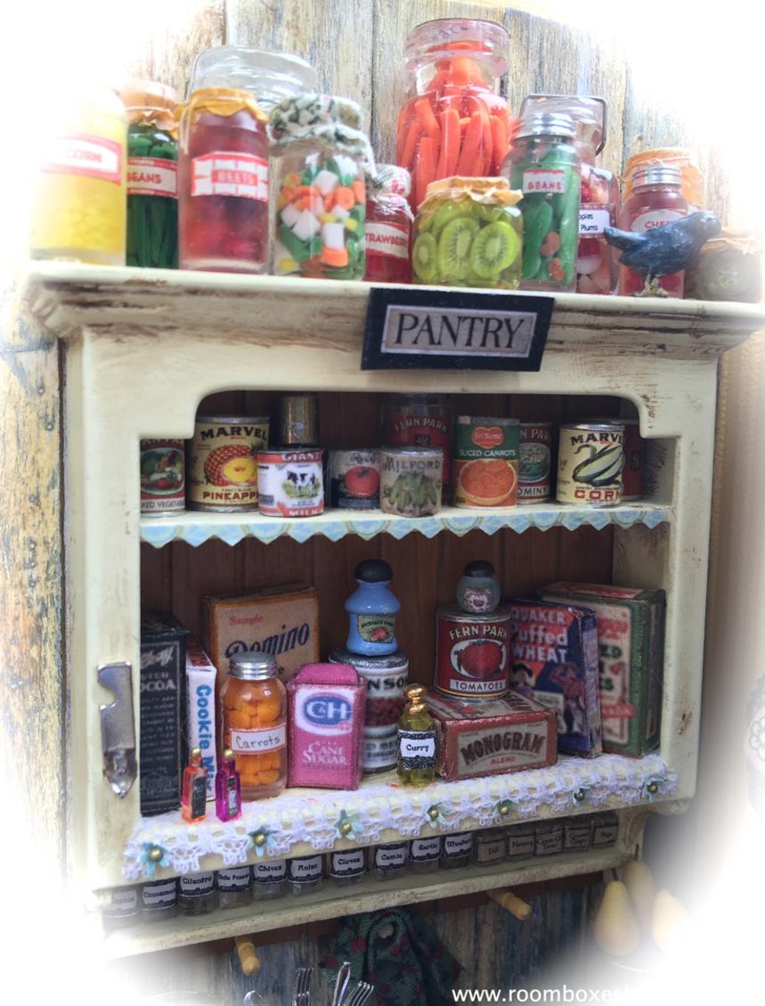 I made some of the cans in the "pantry" and also bought some kits from Belara Beach Originals. The food boxes were internet downloads and some come from Creative Miniature Blogspot.