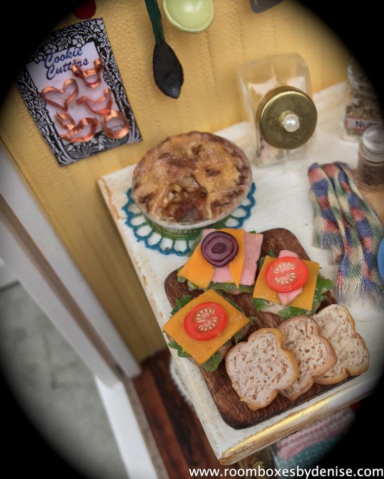 Since I wanted to continue making Premo Sculpey food, I needed to design a box to display them. I thought of making a witch, mouse, Easter or Christmas kitchen, but then decided to make another party themed box. In this scene, an elderly hostess invites her three long time friends over for lunch, and two of them are already seated at the table and one has left the room to perhaps "powder her nose." The hostess has planned soup and sandwiches for lunch and has prepared lots of desserts because she still loves baking. This box has taken nearly six months to complete with weeks taken off here and there as life has a way of interfering with miniatures! Completed March 2015.