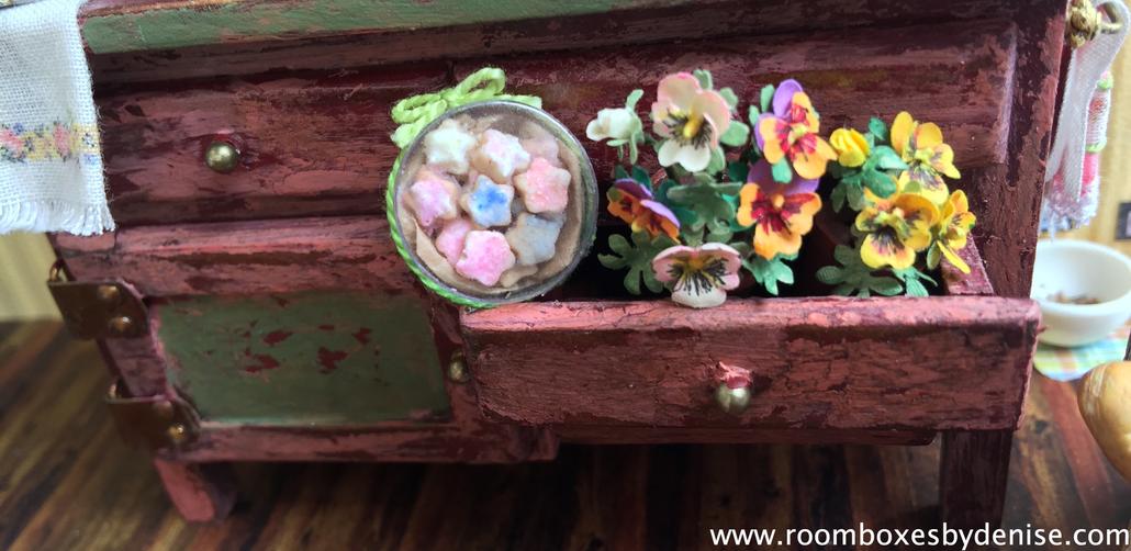 Basket on the left is filled with post cards, clock faces, potted plant, copper cup, kitchen linen and an ivy vine. On the right, I made the flowers in the baskets with plastic embellishments that were then pressed into a mold maker and then filled with a Japanese air dry clay, then painted. Teal teapot was part of a resin kit that I purchased from Lori Potts on Ebay and my daughter Sage painted the tiny pink flowers.